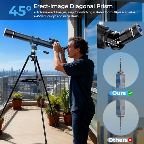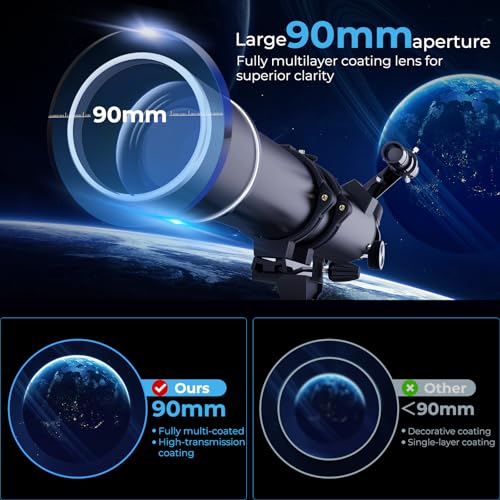 - 【Professional 90mm Aperture & 900mm Focal Length for Superior Clarity】Experience exceptional brightness and detail with this professional refractor telescope. Its true 90mm large aperture gathers significantly more light, while the extended 900mm focal length ensures sharp, high-resolution views. Ideal for observing lunar craters, Jupiter’s bands, Saturn’s rings, and terrestrial targets like birds and landscapes with stunning clarity.