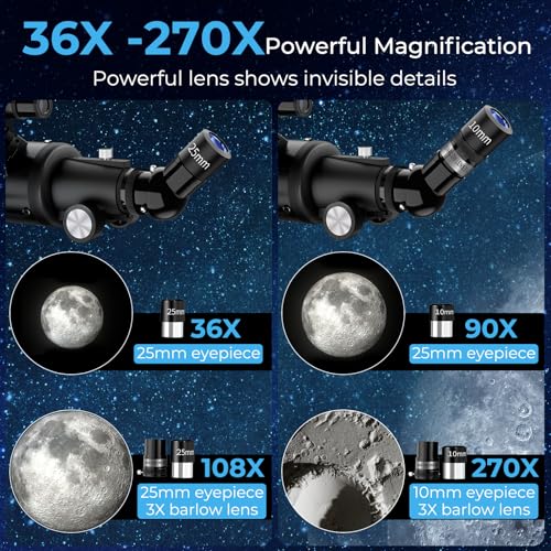 - 【High Magnification Range: 36X to 270X for Versatile Observation】Explore the cosmos and beyond with a flexible magnification system. Equipped with two premium eyepieces and a 3x Barlow lens, this telescope delivers a powerful magnification range from 36X to 270X. Easily switch from wide-field views for locating objects to high-power zoom for inspecting fine planetary or lunar details.
