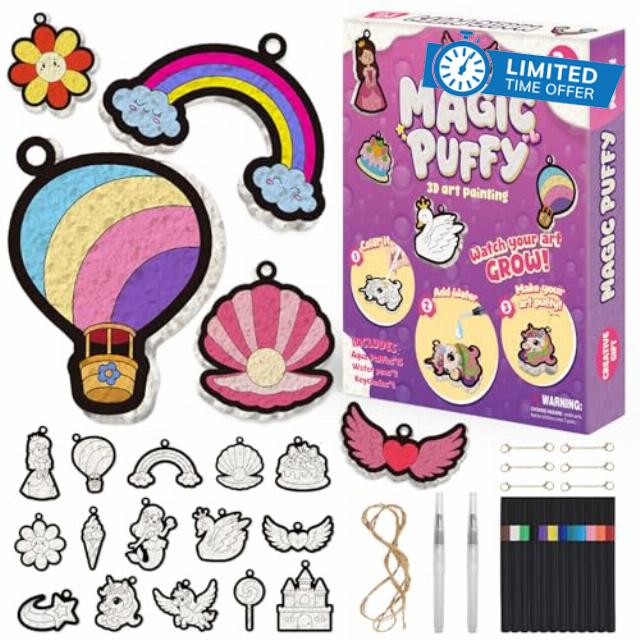 - Magic Foam Texture Painting Kit: Color in adorable unicorns, princesses, and more – then just add water and watch your creations magically puff up! Once dry, loop some string or a keychain through the hole and use them as room decor or awesome accessories!