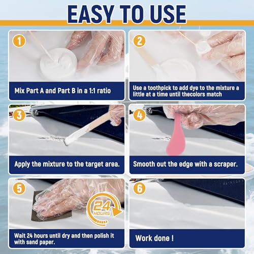 Easy to Use:Repairing your vessel has never been easier. Simply clean the area, mix Part A and Part B in a 1:1 ratio, add color tints if needed (the color gel can only be applied with a toothpick. Do not use too much, as it will affect the hardness), apply the mixture, and allow it to dry for at least 24 hours, and finally sand the surface smooth.This fiberglass filler comes with all the tools and instructions, making it beginner-friendly yet professional-grade.