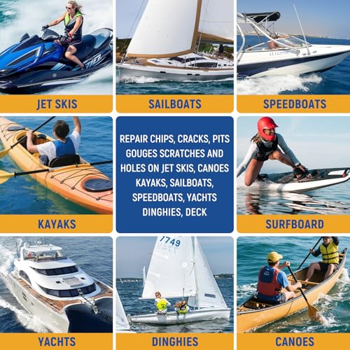 Marine Fiberglass Repair kit:UNDERTHECLOUD Marine Fiberglass Repair kit is the ultimate solution for repairing chips, cracks, pits, gouges, scratches, and holes on various watercraft. It is suitable for repairing chips, cracks, pits, gouges, scratches and holes on various watercraft such as jet skis, canoes, kayaks, sailboats, speedboats, yachts, dinghies, surfboards and decks, keeping the vessels in good condition