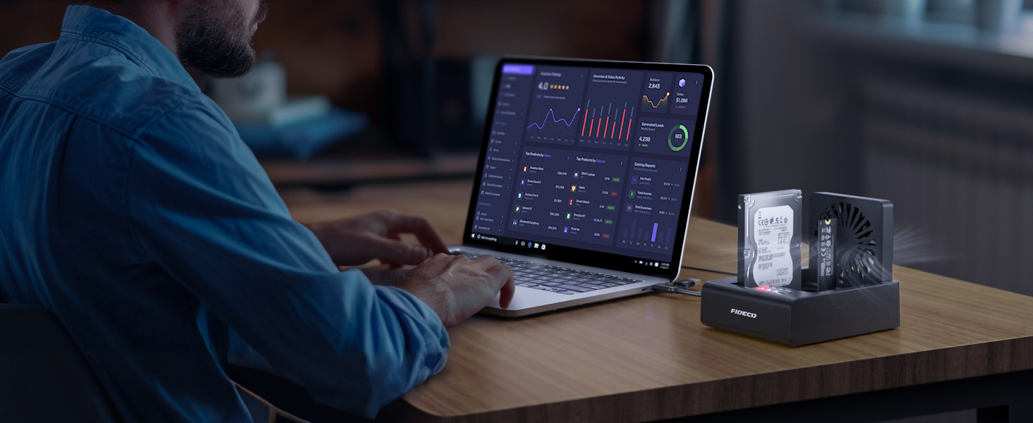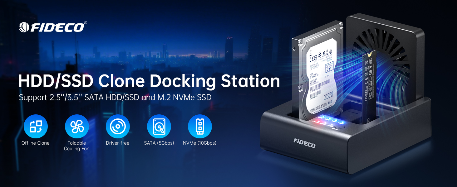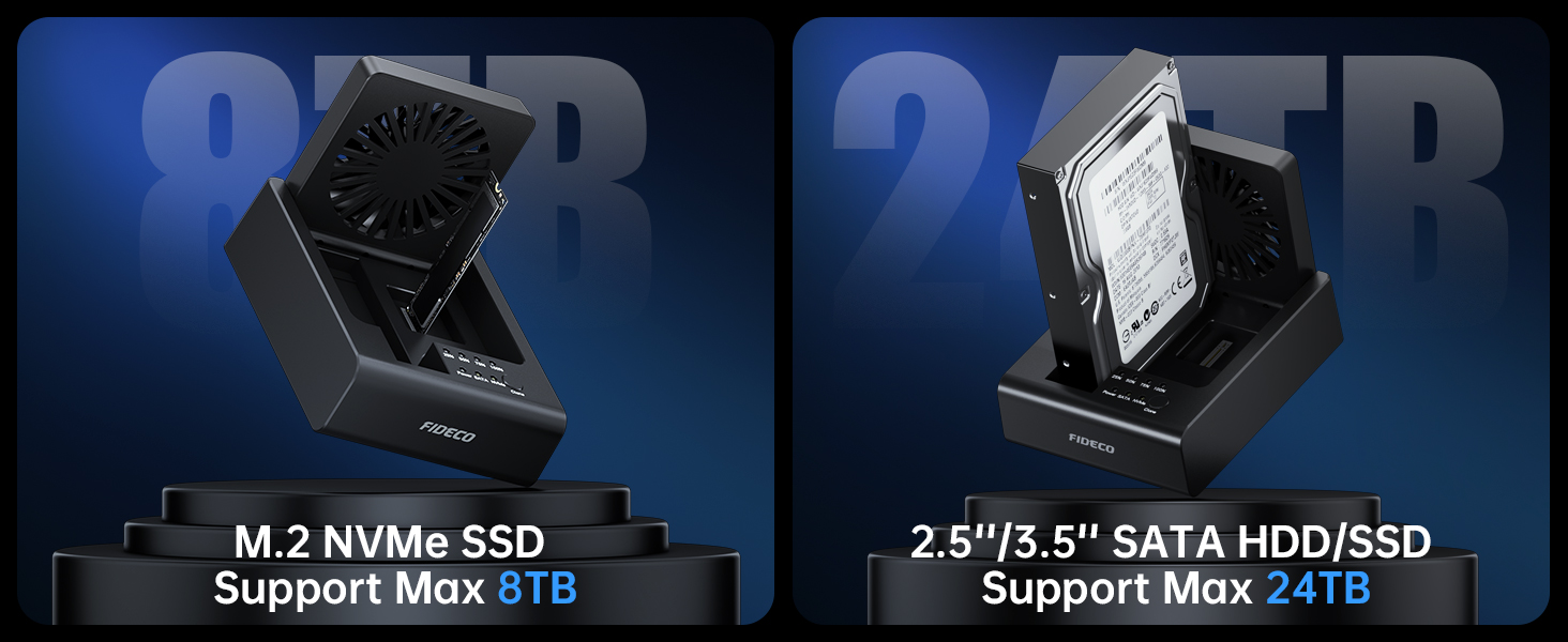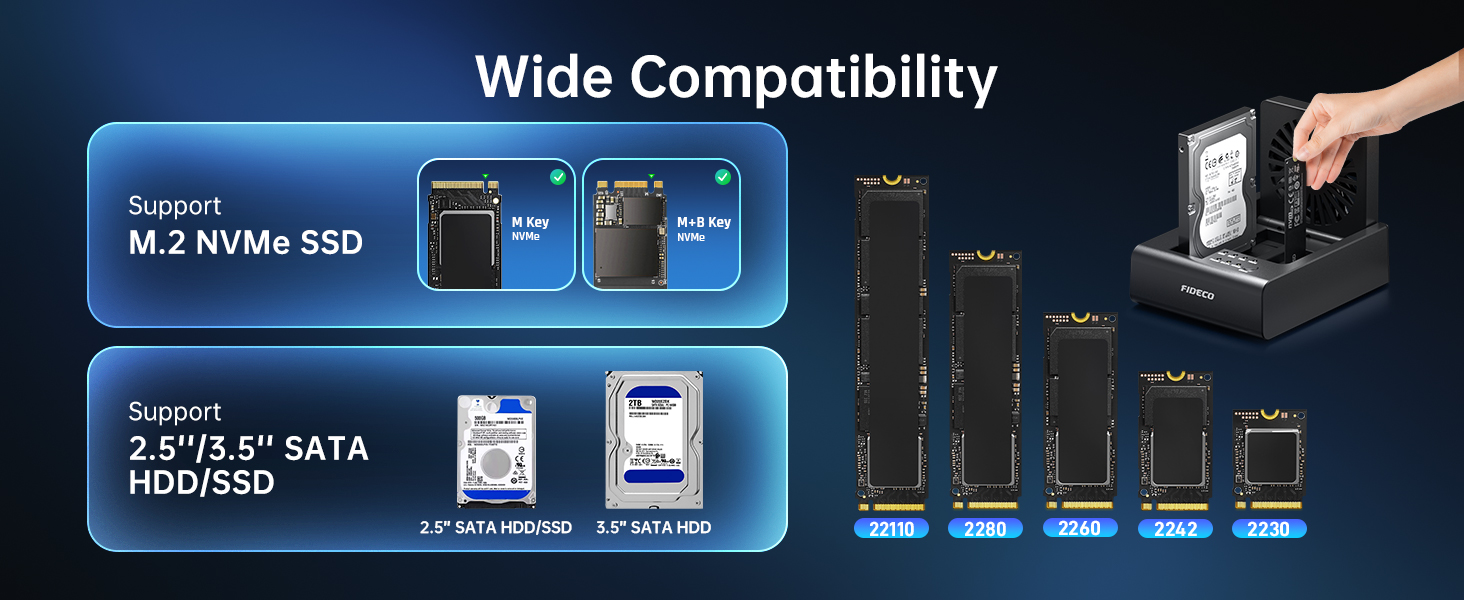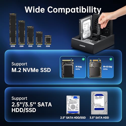 - 【One Dock for All】FIDECO USB C docking station can support M.2 PCIe NVMe SSD with M-Key or M+B Key and 2.5/3.5 inch SATA HDD SSD. The hard drive reader allows you to connect and access one NVMe SSD and one 2.5"/3.5" SATA HDD simultaneously, meeting your needs for different storage setups.