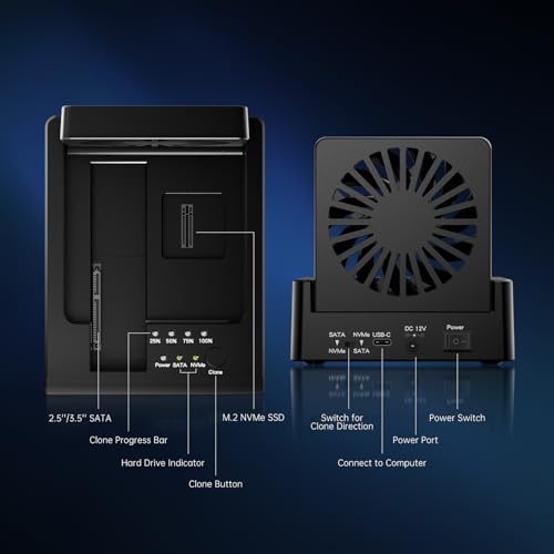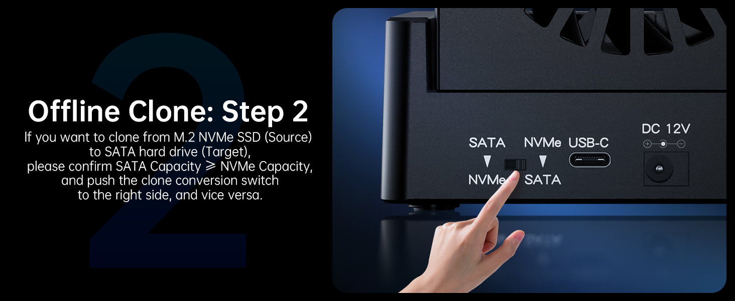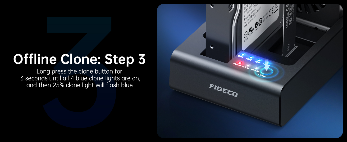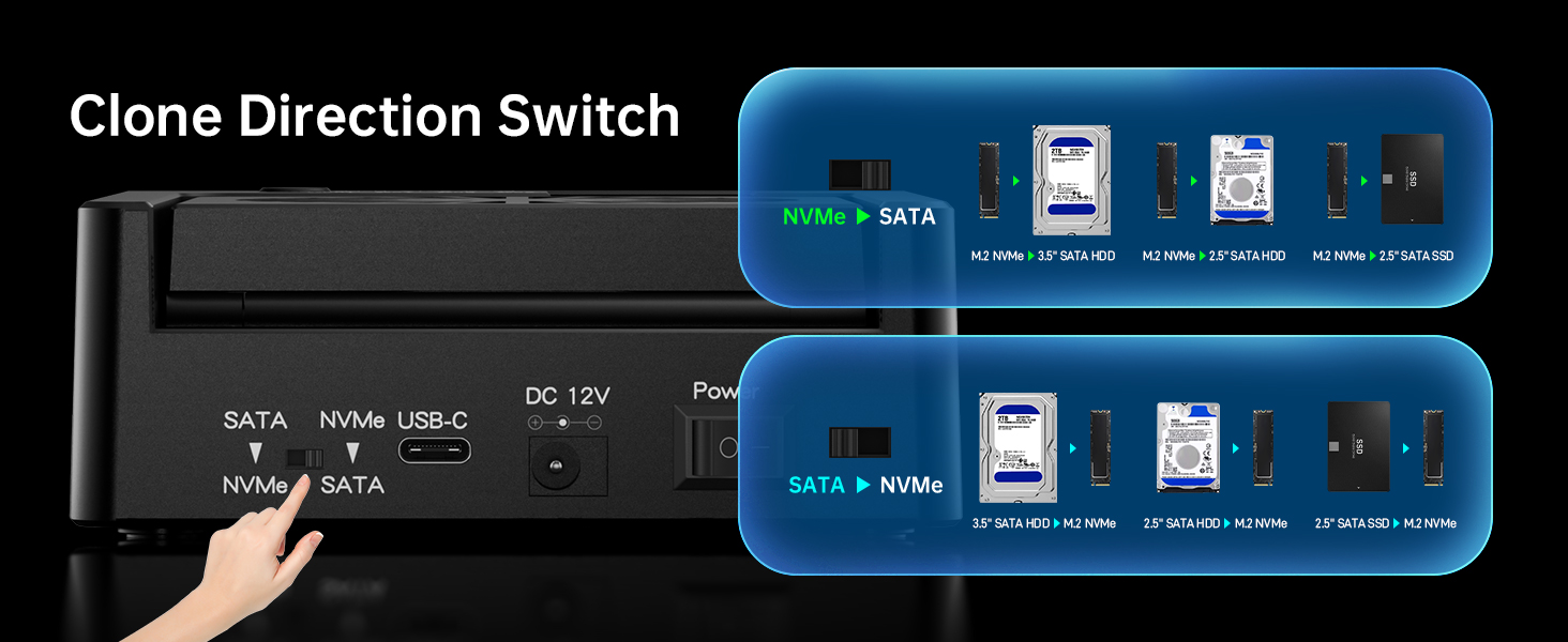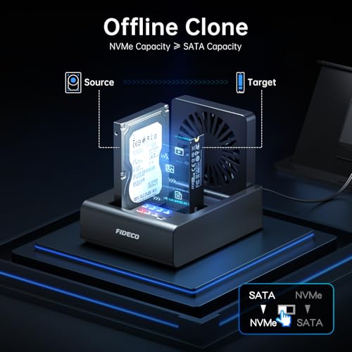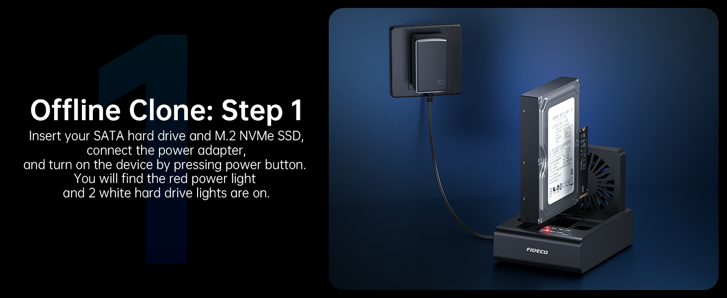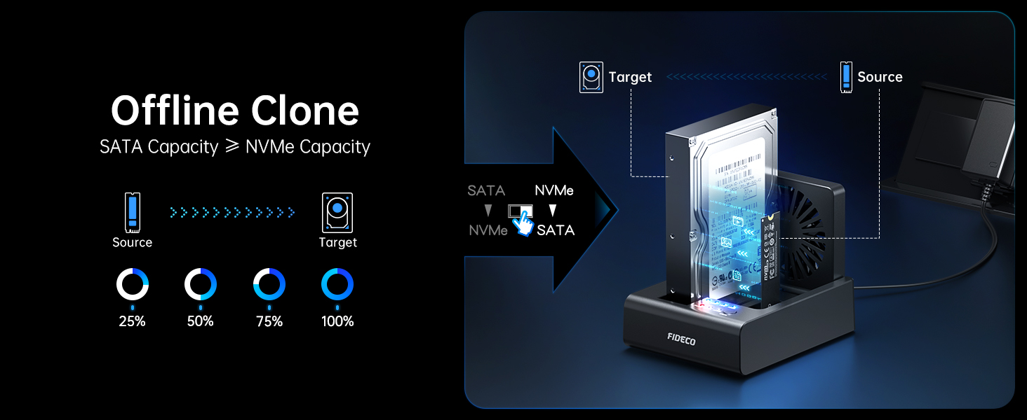 - 【Offline Clone】FIDECO NVMe to USB cloner can support bidirectional offline clone between M.2 PCIe NVMe SSD and 2.5/3.5 inch SATA hard drive. Just push the clone conversion switch to determine the way of clone: NVMe → 2.5"/3.5" SATA, or 2.5"/3.5" SATA → NVMe. Super convenient for you to clone between multiple types of hard drives. Save your time and effort!