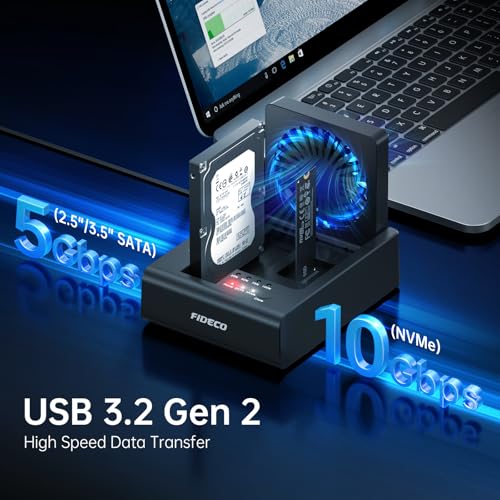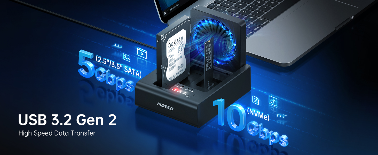 - 【High-Speed Data Transfer】FIDECO NVMe SSD reader features USB 3.2 Gen 2 standard for maximum 10Gbps super fast transfer speed. Transfer large files within minute with no lag. For 2.5/3.5 inch SATA hard drive, the maximum data transfer speed can reach 5Gbps to meet your daily needs.