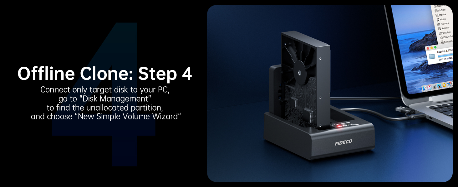 - 【Warm Note for Offline Clone】Start the offline clone with just a single touch for 3-5 seconds. No software is needed! Before offline clone, do ensure the target hard drive capacity is equal to or larger than the source hard drive capacity by checking both disks in Windows "Disk Management". If 4 blue lights are flashing, it means the clone failed.