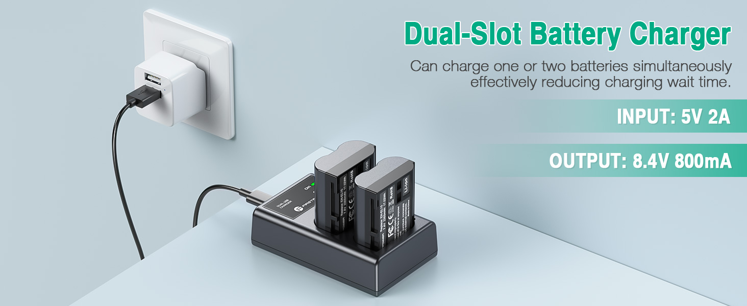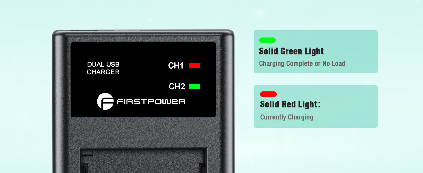 - 【Intelligent LED Charger】Built-in LED indicator shows the charging status of each battery intuitively. RED light means charging, GREEN light means full charge or no battery inserted. Dual charger can charge two batteries simultaneously, effectively saving charging time.