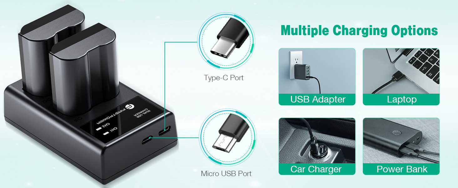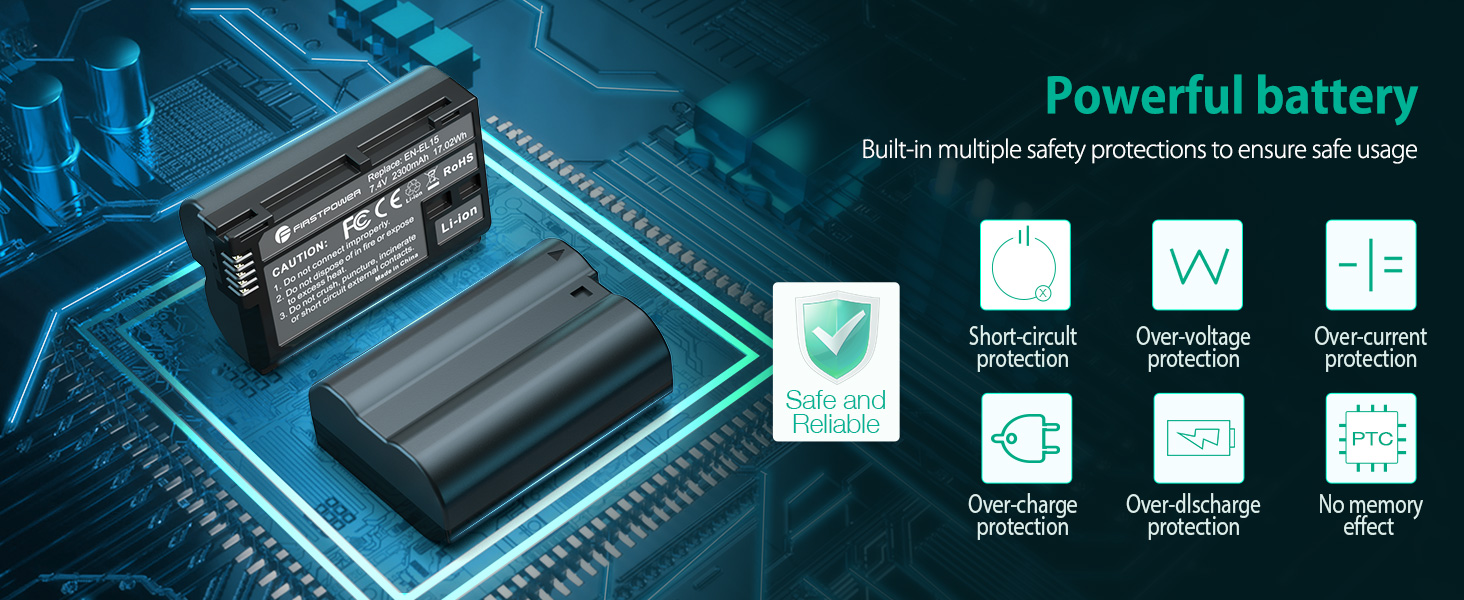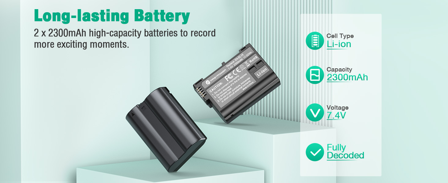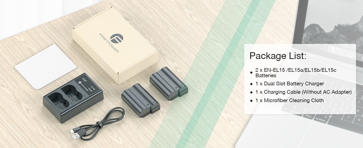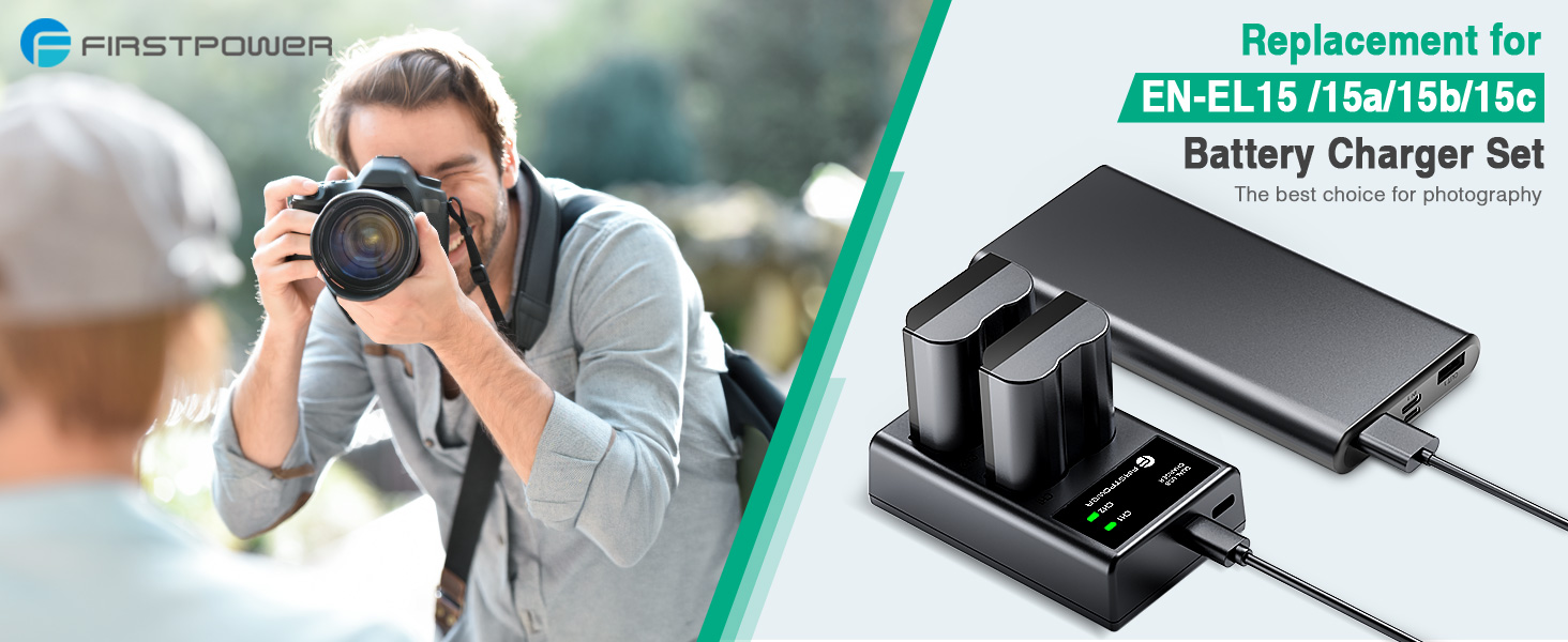 FirstPower rechargeable EN-EL15 batteries 2 packs and dual slot battery charger provide you with a complete backup solution. Take along the extra power for your compatible camera and you'll never miss a precious moment!