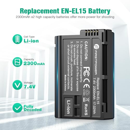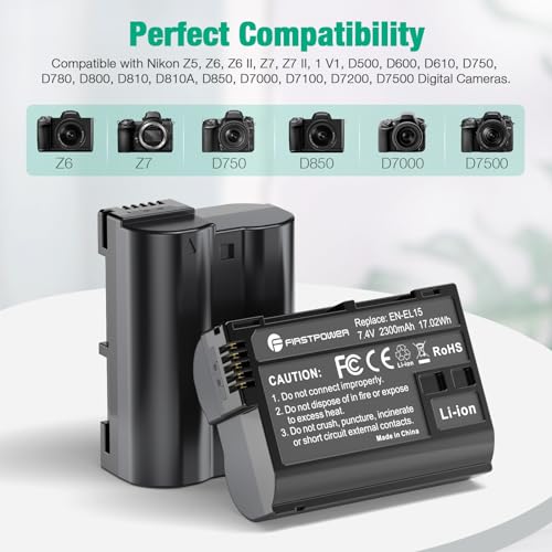 FirstPower EN-EL15/EL15a/EL15b/EL15c Battery 2-Pack and USB Dual Charger Compatible with Nikon Z6 Z7 D750 D850 D7000 D7100 D7200 D7500 D500 D600 D610 D780 D800 D800e D810 D810a Cameras
