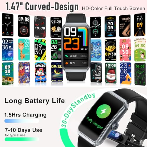 - 【1.47" HD Color Touchscreen】The fitness tracker showcases a sleek curved design and boasts a 1.47" HD color touchscreen, Choose from our extensive collection of 150+ cloud-based watch faces to personalize your device according to your preferences