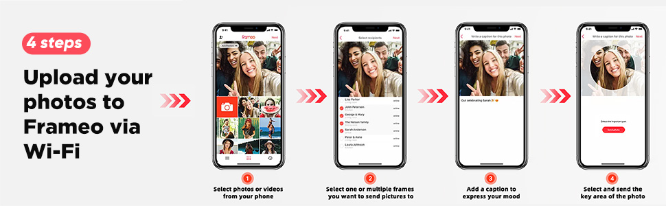 Share photos and videos privately and securely: No matter where you are, you can send photos or short videos (up to 15 seconds) directly through the FRAMEO APP, allowing friends and family to instantly enjoy your precious moments through this WiFi digital photo frame. The "frameo" APP for iOS and Android gives you complete control over your digital photo frame. It has 32GB of built-in storage, supports Micro SD card expansion, and can import and export images and videos.
