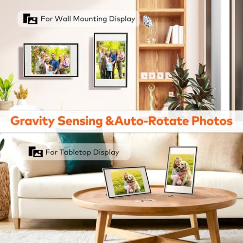 - [Auto Rotation & Built-in 64GB Storage & 128GB External SD Card/USB Flash] ①Automatic rotation electronic frame easy to place on the computer or hang on the wall and equipped with a computer stand or wall mount. Display every moment and share it instantly with your family/lover and you can send photos or videos to the digital frame from anywhere in the world. KPKUE electronic photo frame features video playback with your photo or SD card insert or USB flash. ② It has 64GB built-in memory and supports up to 128GB external storage, allows you to share 8000+ photos. (Note: There is no time limit for video uploads via SD/USB flash; Frameo app allows uploading only 15 second videos).