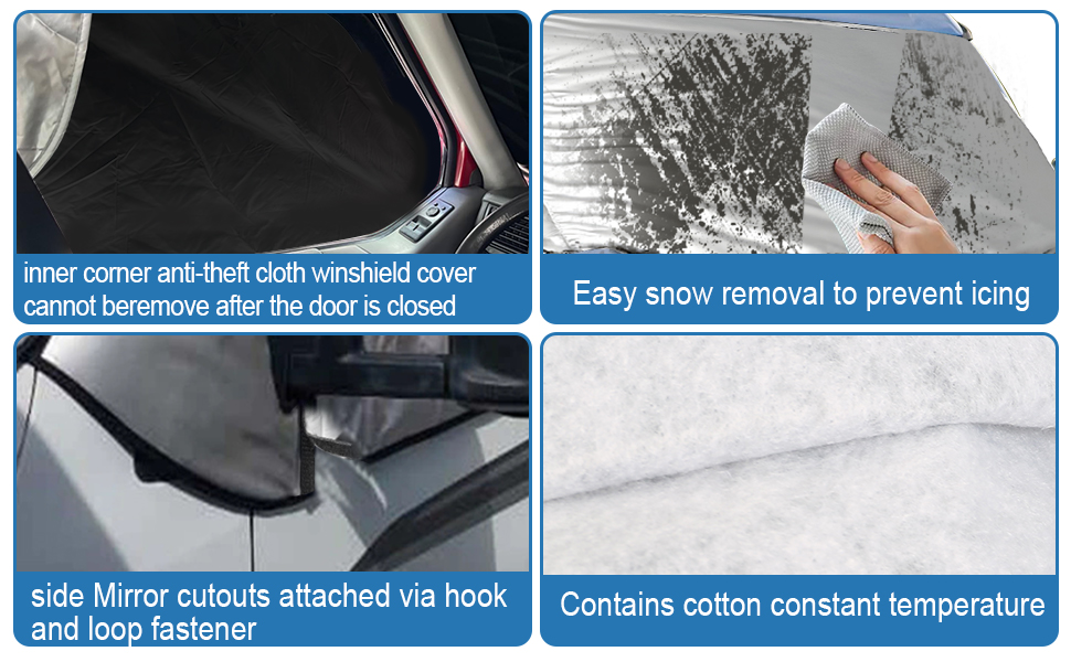Premium Material: Our thickened windscreen covers consist of five layers of materials. Both the outer and inner layers of windscreen cover are made of 210D waterproof silver coated Oxford cloth, making the cover stronger, wear-resistant and not easy to tear; filled with alumnium film, thermal insulation pearl cotton and sponge-like cotton cloth in the middle, the car windscreen cover is opaque and ultraviolet-proof, thicker and softer, warm in winter and cool in summer