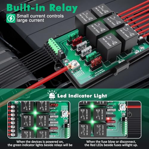 LED Indicator Light: The relay box 12v is equipped with an LED indicator for each relay and blade fuse to let you know its working status, with overvoltage protection and surge protection safety protection design