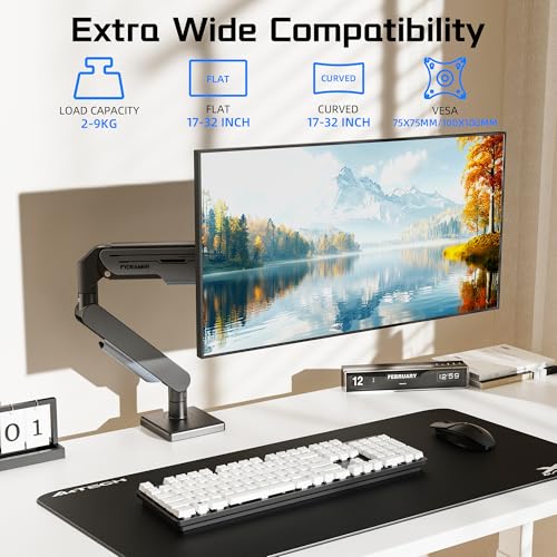 Fydeamer Single Monitor Arm, Heavy Duty Gas Spring Mount for 17-32 Inch Screens up to 9kg, Full Motion Adjustable Desk Mount with VESA 75×75/100x100mm Compatibility, Dark Grey