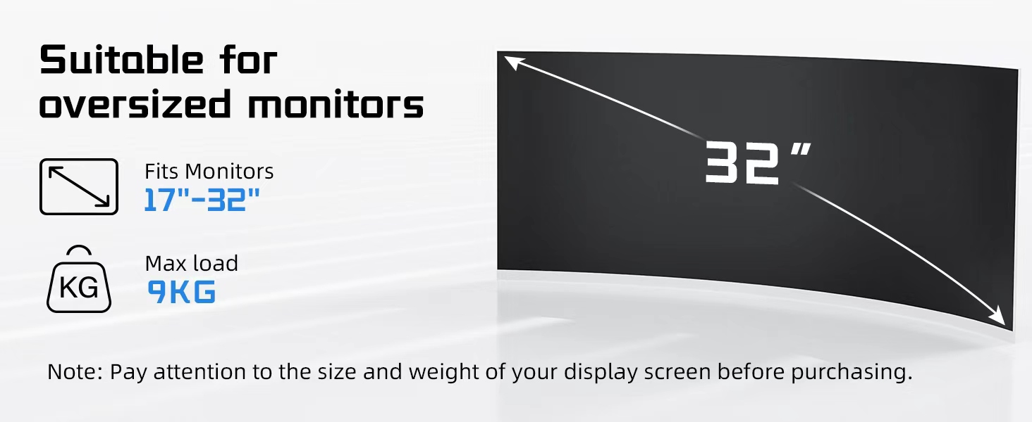 - 【Universal Monitor Compatibility】 This single monitor arm accommodates 17-32 inch screens weighing 2-9 kg with VESA 75x75mm and 100x100mm patterns. The versatile design ensures perfect compatibility with most monitor models while providing reliable support for home office or professional workspace setups, maintaining secure positioning and optimal viewing angles for daily extended use.