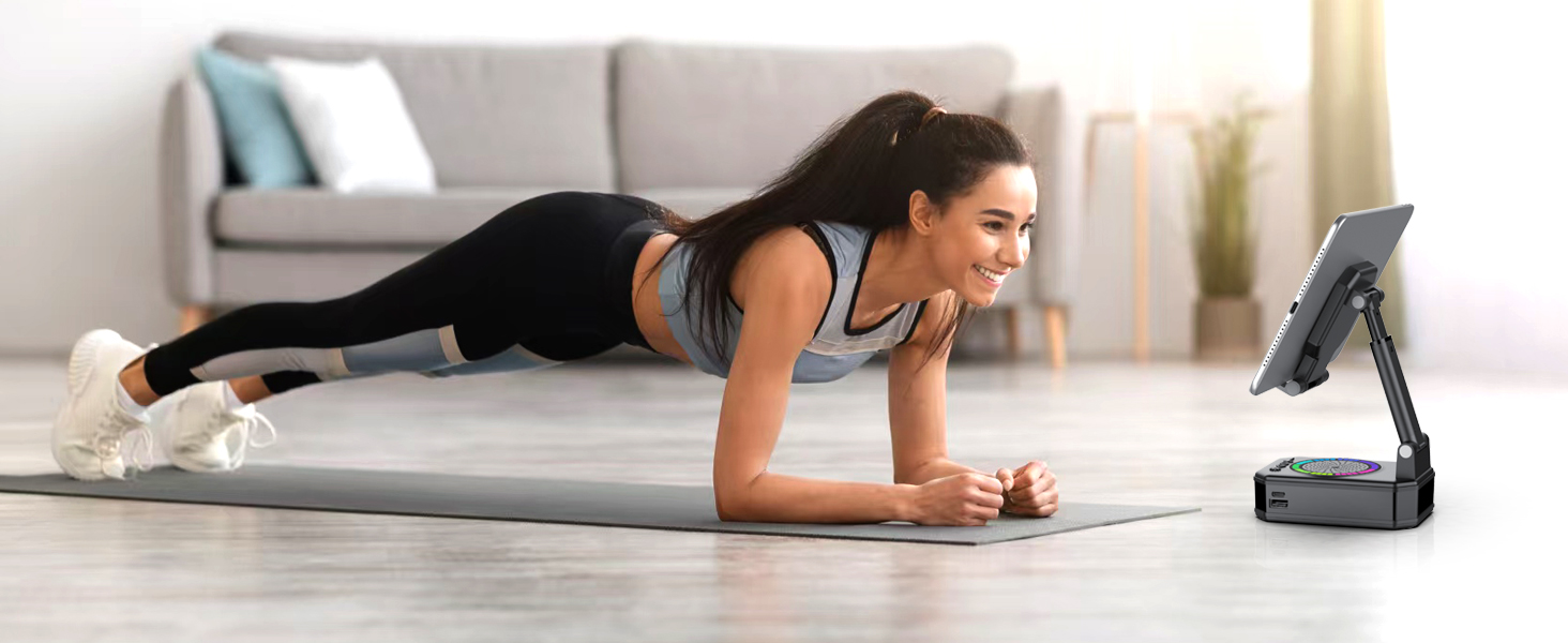 - Stability and Adjustable Stand: The wireless speaker with phone holder features a widened anti-slip base, secure backplate, and silicone grooves that firmly grip your device. The adjustable phone stand with Bluetooth speaker wireless has 2 rotating axis points and a retractable rod, allowing you to freely adjust the height or angle. Whether watching videos, camping outdoors, doing housework, or showering, your phone, tablet, or e-reader stays steady and safe. Take calls, share stories, or follow recipes with confidence — no more slipping or falling devices.