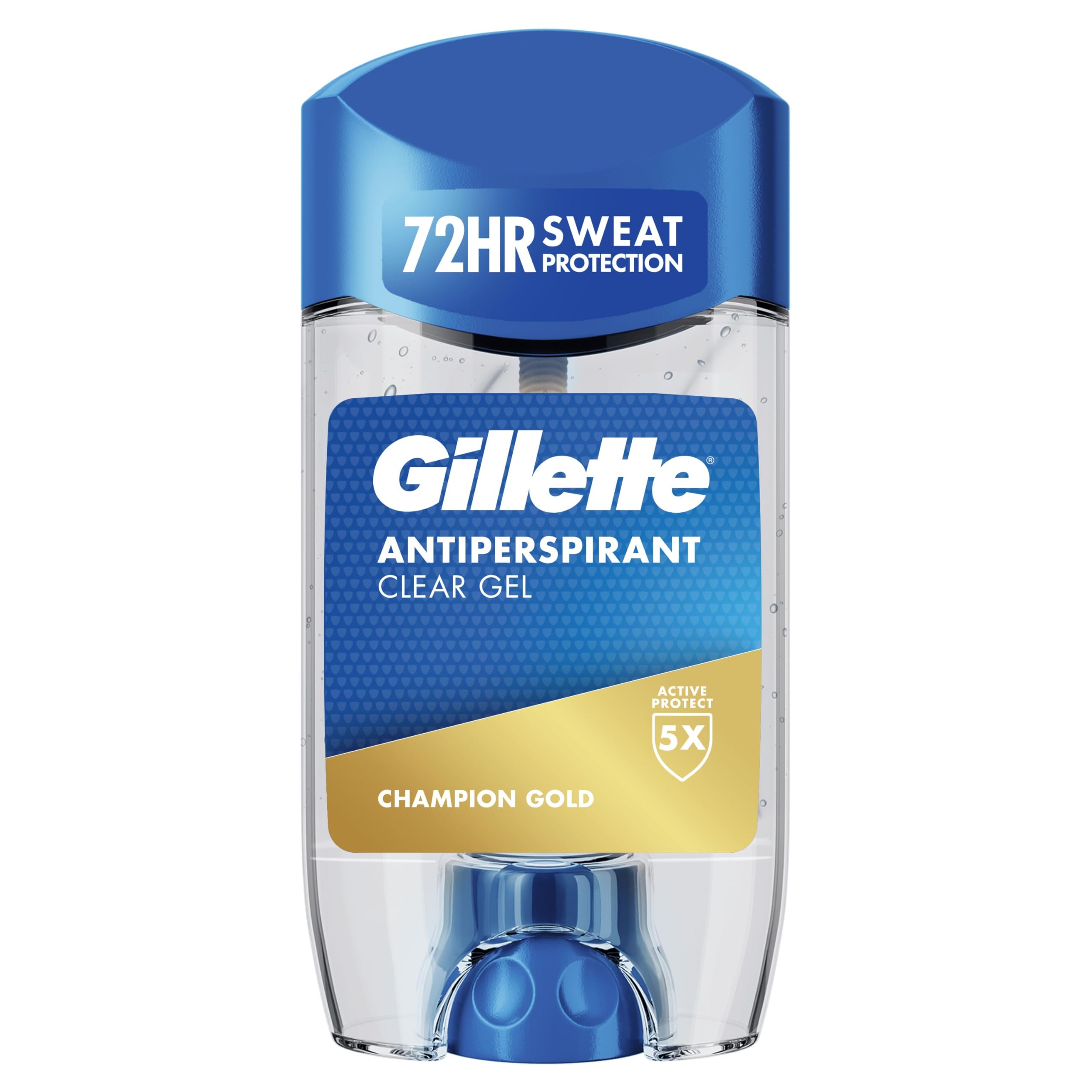 Choose Gillette Antiperspirants for the ultimate 72 hours of sweat protection, ensuring you’re ready for any challenge and can become the best version of yourself. Gillette Antiperspirant Clear Gel with 5X Active Protect is fast-acting, providing both sweat and odour protection while preventing white marks and fighting odour-causing bacteria. Enjoy the enduring watery fragrance of Gillette Champion Gold: with outdoor freshness, melon, and citrus elements. With Gillette Antiperspirant Clear Gel, the choice is clear. It delivers 2X stronger sweat protection compared to P&G roll-on products, and the transparent gel formula goes on clear and stays clear on skin throughout the day. Apply a thin layer to your underarms with confidence and stay protected, no matter what challenges lie ahead.