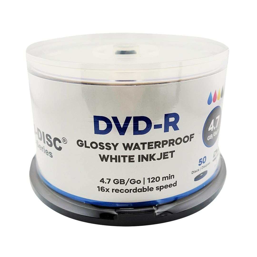 Glossy Waterproof White Inkjet DVD-R 16x – 4.7GB/120min Blank Recordable Discs – Hub Printable – High-Gloss Waterproof Finish (100)