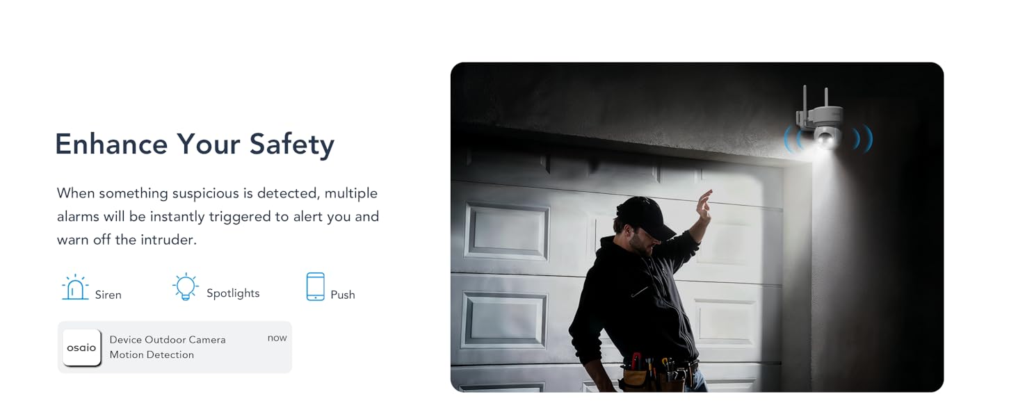 - 【PIR Motion Sensor with Spotlights & Siren】 GNCC outdoor security camera is equipped with an advanced PIR sensor that dramatically reduces false alerts from leaves, insects, or passing cars-ensuring you only get notified when it really matters. When motion is detected, it sends instant alarm notifications, auto-records 8-16 seconds of video to preserve crucial evidence, and activates a loud siren and spotlight to deter intruders, safeguarding your home day and night.