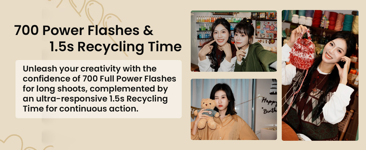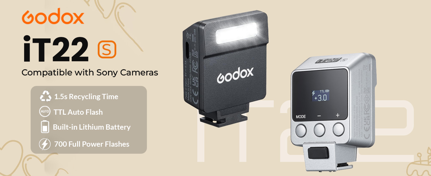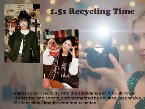 Built-In Rechargeable Battery with Fast Recycle: Equipped with a built-in USB-C rechargeable lithium battery, the iT22 delivers up to 700 full-power pops and features a 1.5s recycle time—with full recharge in just about one hour. A simple user interface and clear display make setup and adjustments fast and intuitive. Easily monitor battery status and flash settings right on the screen.