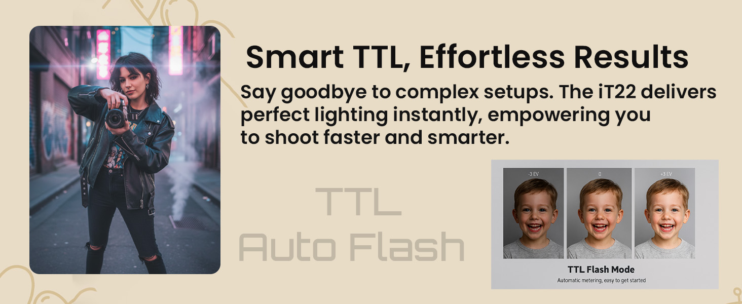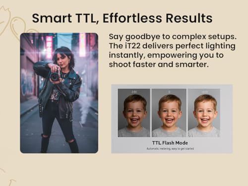 ⚠️Reminder !TTL Flash with Auto Exposure, NO HSS Funtion: The IT22 supports TTL (Through-The-Lens) metering, allowing for automatic flash output adjustment based on the scene's lighting, making exposure faster and more accurate. However, please NOTE:This flash does not support High-Speed Sync (HSS). To ensure proper flash synchronization, we recommend using a shutter speed of 1/160s or slower.