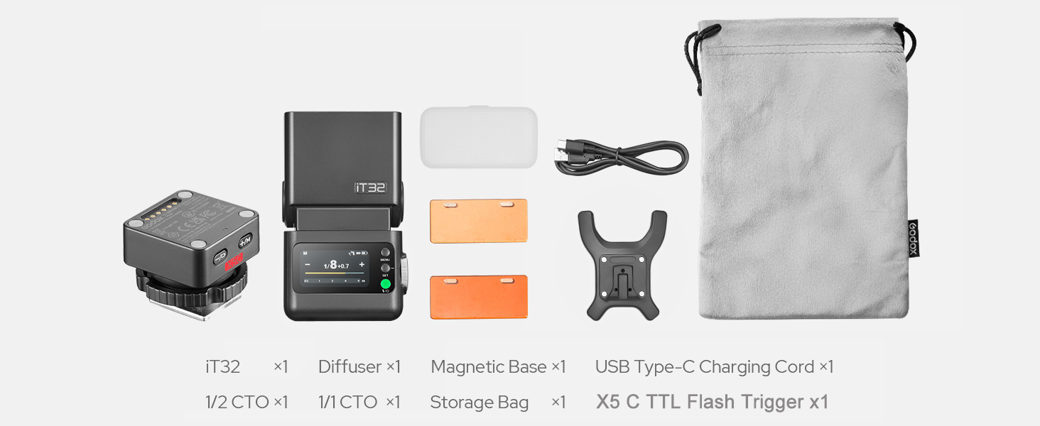 - [One System, Built for All] The iT32 & X5 offer a universal solution for photographers working across different camera systems. Its interchangeable magnetic X5 hotshoe allows instant switching between brands by simply changing the X5 version. This flexible design helps photographers focus more on creativity and less on equipment compatibility.