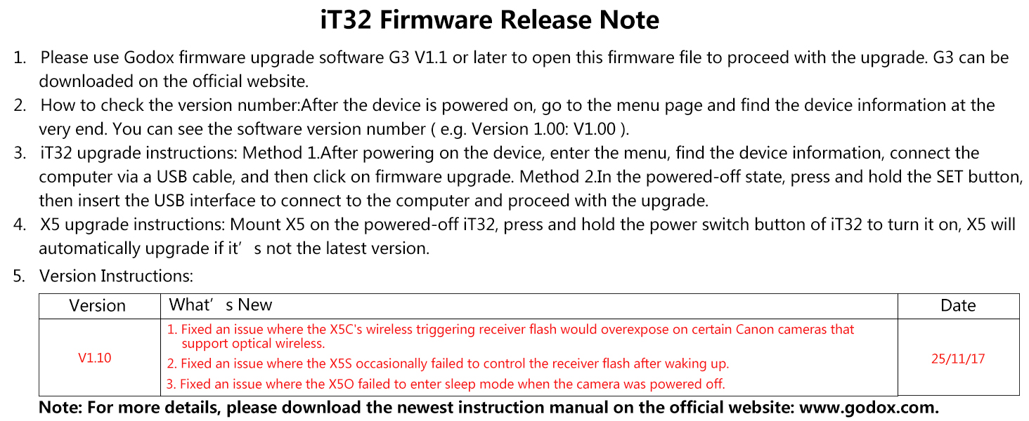 | Power Supply | Lithium Battery: iT32: 7.4V/900mAh; X5: 3.8V/100mAh; Recycle Time (1/1 step): Approx. 1.5s; Number of Flashes (1/1 step): Approx. 510; Power Saving: Provide standby and auto off functions; Sync Triggering Mode: Hot shoe, 2.5mm sync cord |