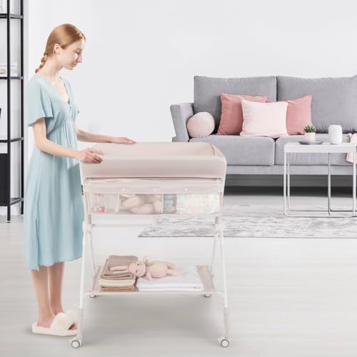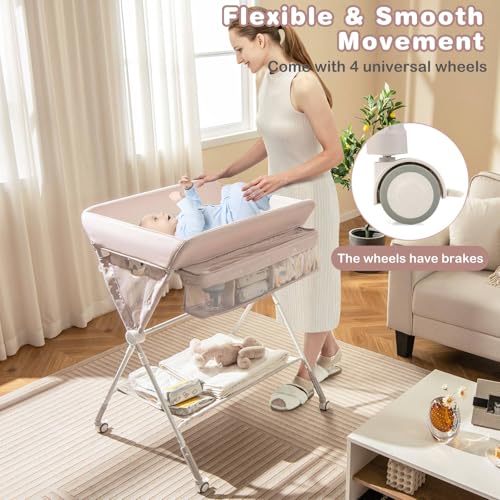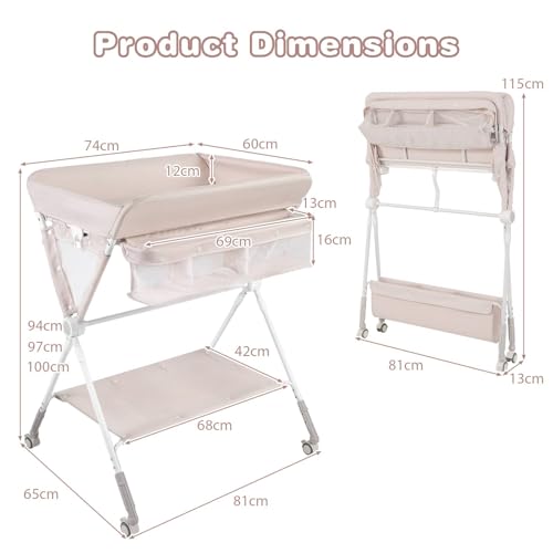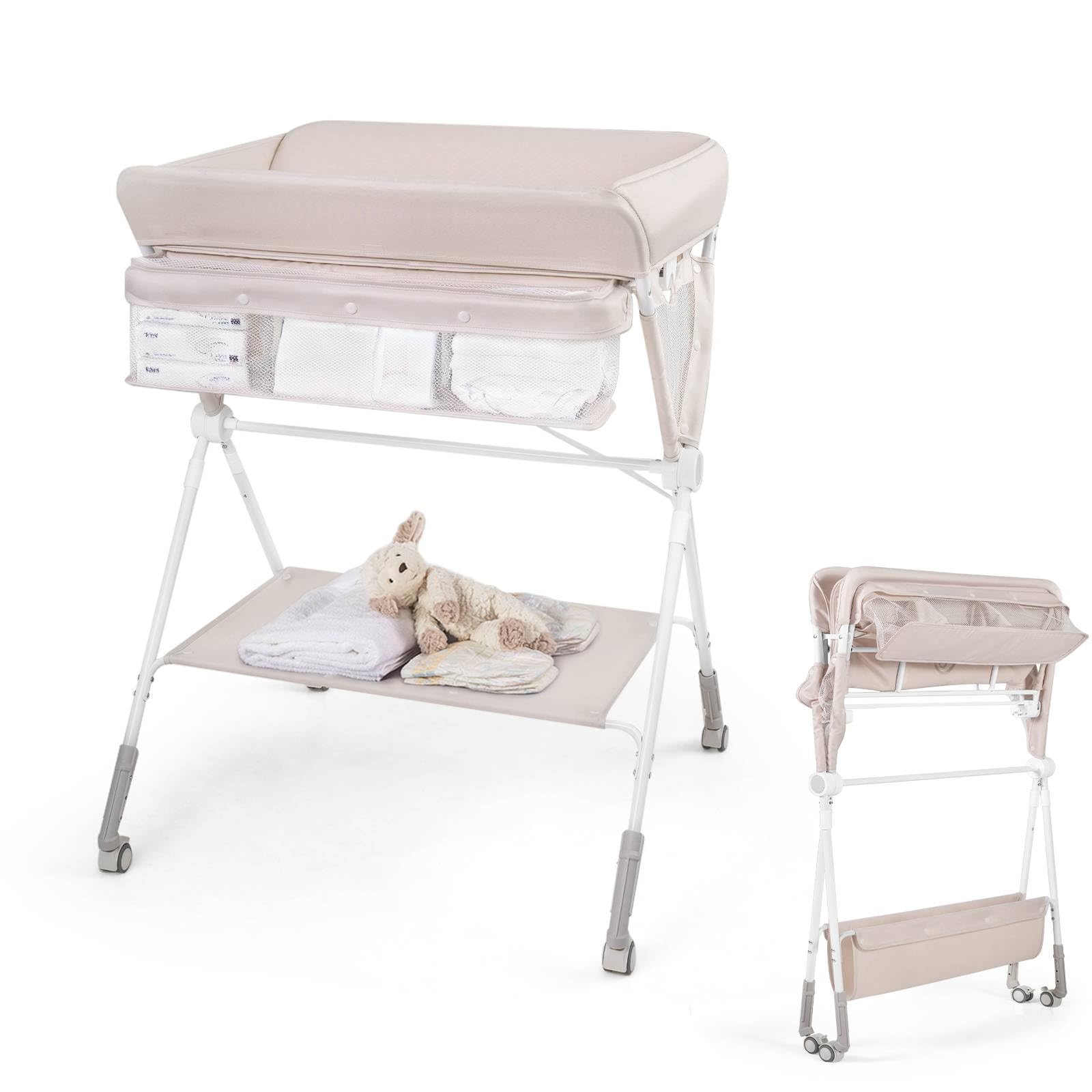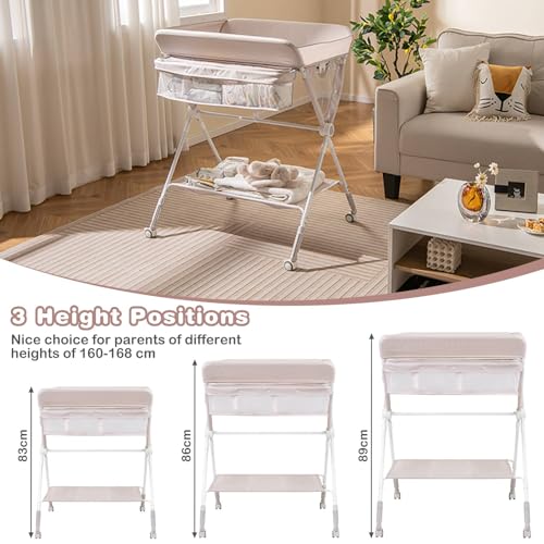 GYMAX Folding Baby Changing Table, Hight Adjustable Infant Diaper Changing Station with Wheels and Storage Basket, Portable Newborn Care Station (Beige)