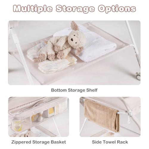 - ✔AMPLE STORAGE SPACE- The folding baby changing table is equipped with a zippered 3-compartment storage basket, side towel rack and bottom storage shelf, which can keep all your baby's essentials such as diapers, wipes, clothes, etc. within arm's reach.