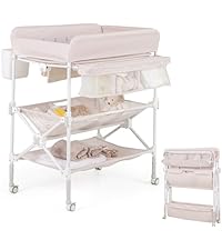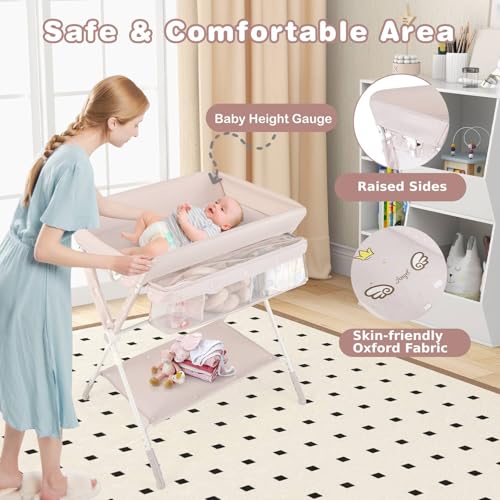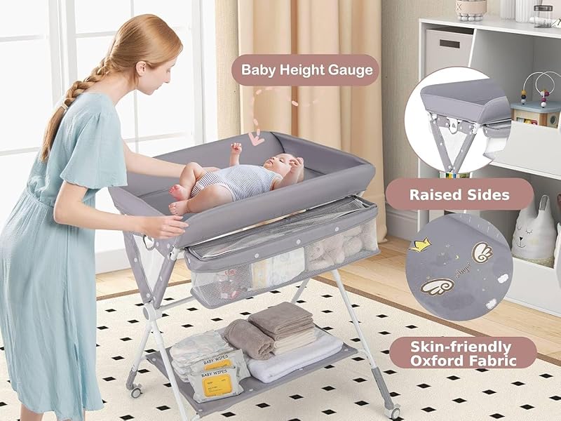 - ✔CONSIDERATE DESIGN- The sturdy metal tubes offer strong support, and the middle reinforced crossbar ensures additional sturdiness. Heightened 4 sides create a protective space for your baby, while the height gauge on the changing pad makes it easy to keep track of the baby's growth. In addition, there is a small trash can for added convenience.