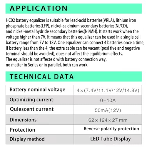 - 【 Functional Features 】 The Battery Equalizer Hc02 Automatically Maintains The Balance State Of The Battery, Preventing Overcharging And Overdischarging Of The Battery. No Maintenance Required. The Compensation Current Is 0-10A, And The Nominal Voltage Of The Battery Is 4 * (7.4V/11.1V/12V/14.8V) With Low Self Loss And Long Service Life
