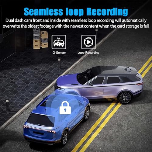 - 【Full HD 1080P Resolution 】Dash Cam Car Recorder deliver 1920×1080 front video + 640×480 cabin inside video and rear video, provide all in clear and sharp videos quality, you can easily switch between the front, inside, cameras to view different angles of the vehicle.