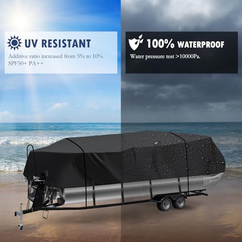 【100% Waterproof】Our boat cover has a triple-layer waterproof PU coating, resisting up to 10000 Pa water pressure. Sealed seams with waterproof tape prevent leaks