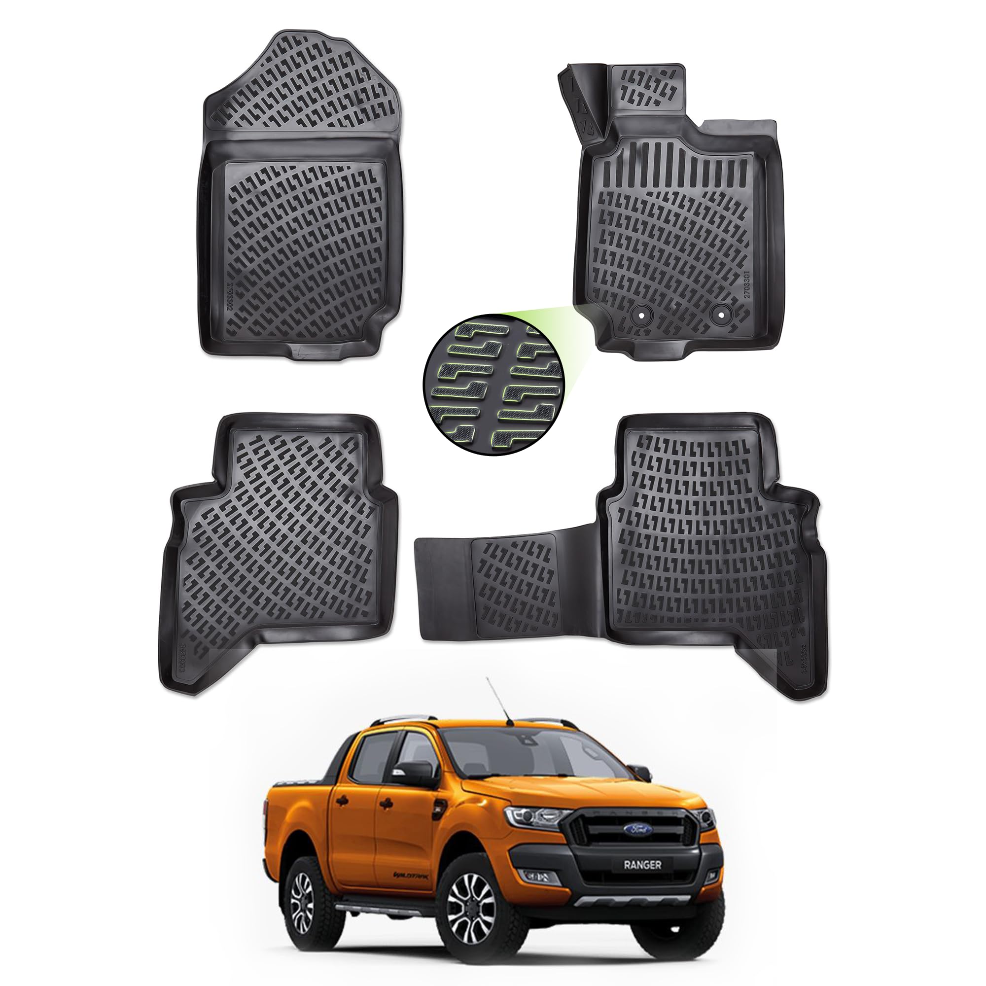 Heavy-Duty Rubber Floor Mats for Ford Ranger 2012–2022 – Waterproof Non-Slip Vehicle Mats with OEM Fixing Clips – Compatible with Ford Ranger T6 T7 T8 Double Cab – Set of 4