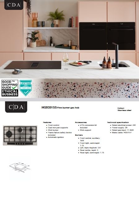 Experience professional cooking performance with the HG9351SS Five Burner Gas Hob, designed for both style and efficiency. This 86cm stainless steel gas hob features five high-performance burners, including a powerful central wok burner, ideal for rapid boiling, searing, and stir-frying. Durable cast iron pan supports offer excellent stability and a premium finish, while the front-mounted rotary controls ensure easy and precise heat adjustment. Engineered with safety in mind, the flame failure device automatically cuts off the gas if a flame goes out, offering complete peace of mind. The HG9351SS can also be converted for LPG use, making it suitable for a variety of kitchen setups. Sleek, modern, and built to last, this gas hob combines stylish design with exceptional functionality — perfect for any modern kitchen.
