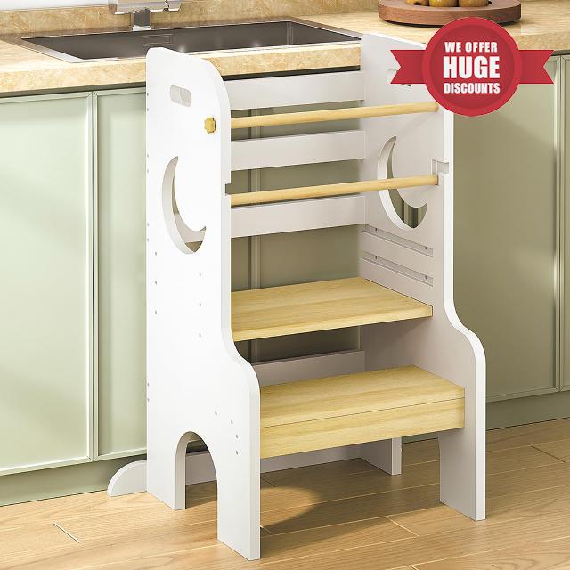- Built to Last: Crafted from high-quality MDF, this toddler standing tower ensures exceptional sturdiness and reliability. The reinforced bottom panel enhances lateral support, while the detachable anti-drop guards provide comprehensive safety for your child