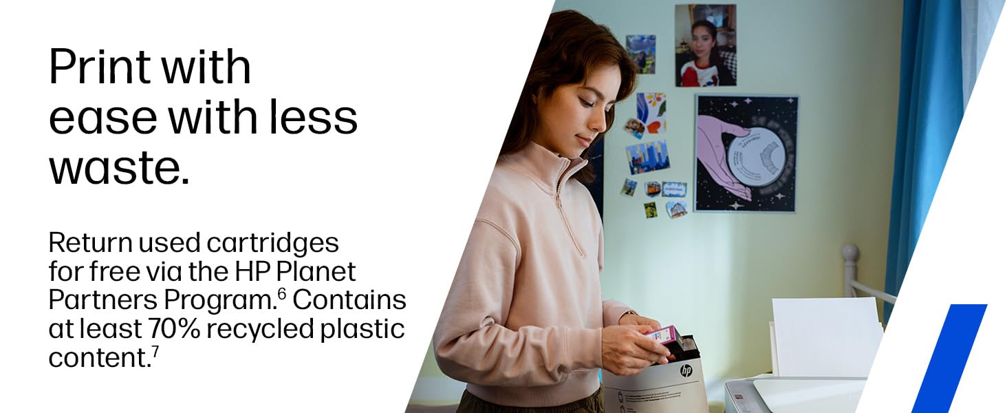 - PRINT WITH EASE WITH LESS WASTE: One billion printer cartridges recycled and counting. Return used cartridges for free via the HP Planet Partners Program. Contains at least 70% recycled plastic content.