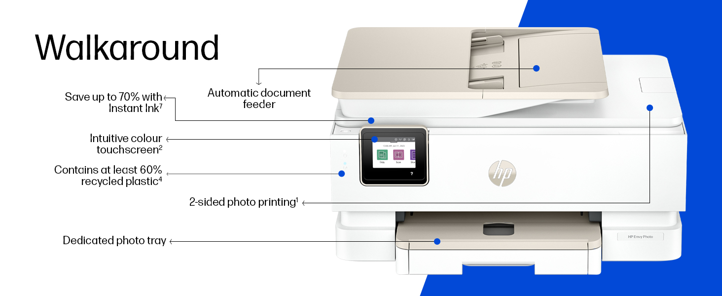 SLEEK SUSTAINABLE DESIGN: Modernize your space with a sleek and productive design, seamlessly complementing your workspace or living area. This HP Envy Photo All-in-One printer contains at least 60% recycled plastic content.