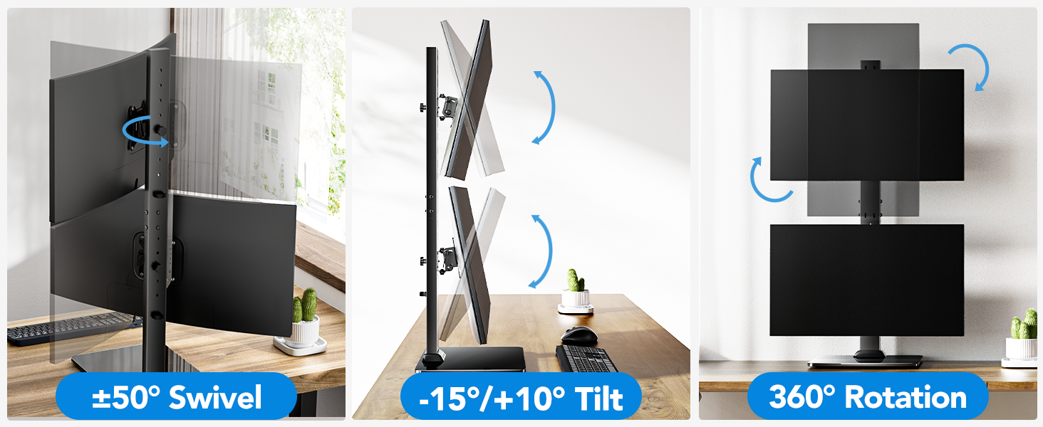 - View From Any Angle: Our dual monitor mount enables customizable viewing with a tool-free tilt range of -15° to +10° and a +/-50° swivel for both monitors. Rotate smaller monitors 360° on the stand – for portrait or landscape in an instant.