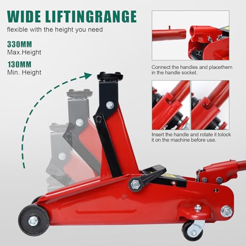 - Large lifting range: with a lifting range of 130-330 mm, our hydraulic jack can meet a wide range of lifting requirements. The freely adjustable height makes it the perfect accessory if you want to change a tyre or fix a problem with your car's chassis.