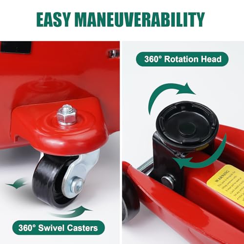 - EASY TO MOVE This trolley jack provides reliable support. For precise positioning. Equipped with a carry handle, 2 fixed metal wheels and 2 360° steerable metal wheels for easy mobility, it helps you to easily transport, maneuver smoothly and work efficiently.