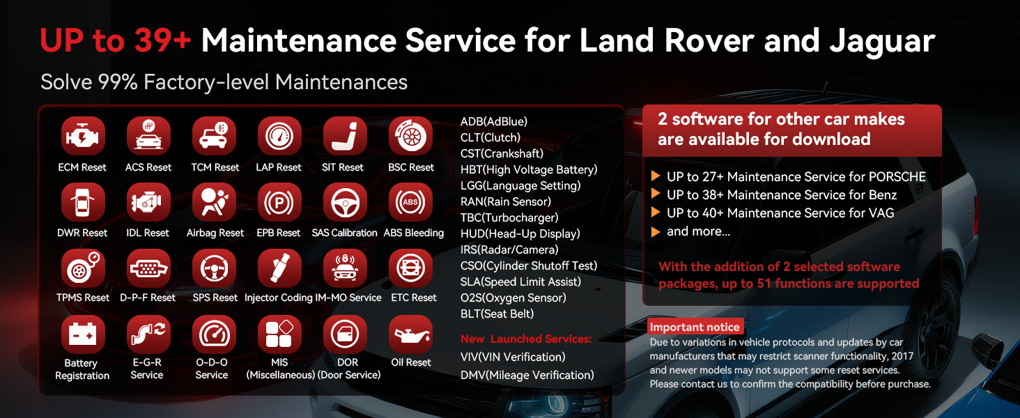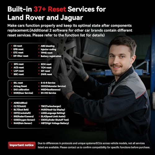 【37+ Specialized Service Functions】Fully equipped for Land Rover maintenance, this car diagnostic tool provides 37 reset services. Essential functions include Oil Reset, SAS, EPB, BMS, ETC, DP-F, ABS Bleeding, Injector Coding, TPMS, Air Suspension, A/C Service, Body Stability, Engine Control, Transmission, Seat; Door-Window-Roof, Engine Idle, Immobi.lizer, EGR, Odo.meter, AdBlue, Clutch, Crankshaft, HV Battery, Rain Sensor, Turbo, HUD; Radar/Camera, Cylinder Shutoff, Speed Limit, Oxygen Sensor. Enhanced with 5 new features: Yaw Rate Calibration, Powertrain Reset, Stepper Motor Init/Reprogram, A/C Compressor Reset. ***Service availability depends on vehicle system configuration!