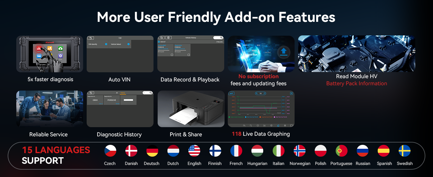 【All-in-One Diagnostic Tool for Land Rover + 2 Extra Brands】iCarsoft LR V4.0 is a professional car scanner specifically engineered for Land Rover vehicles, with dedicated software pre-installed. Powered by a quad-core 1.3GHz processor and 5-inch touchscreen (854×480 resolution), this diagnostic tool delivers smooth operation and intuitive control. You can also download 2 additional software packages from 26 supported brands (e.g., for BENZ, for VAG, for BMW, for Porsche, for Opel), making this OBD2 scanner a versatile diagnostic solution for multiple vehicle brands.