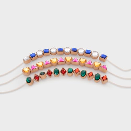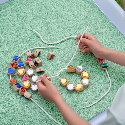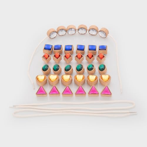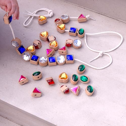 - RADIANT WOODEN JEWELS: Beautifully faceted wooden jewels with light-catching surfaces that captivate children, adding visual sparkle and tactile interest to threading and creative play.