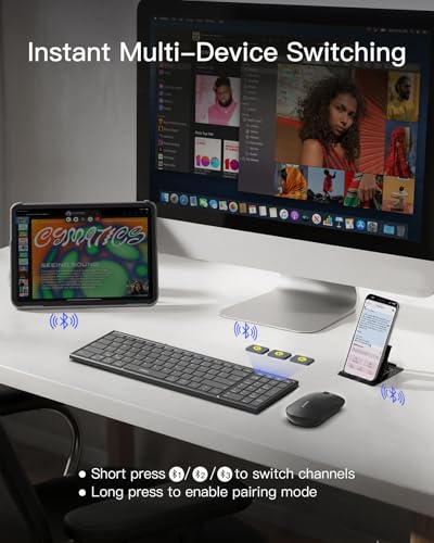 - Multiple Devices Connected: The foldable keyboard with mouse offers seamless connectivity for up to 3 devices (2.4G+BT1+BT2). You can connect a laptop, tablet, and smartphone simultaneously and switch between them easily with the press of a button. Compatible with iPad, iPhone, Mac, Android, and Windows