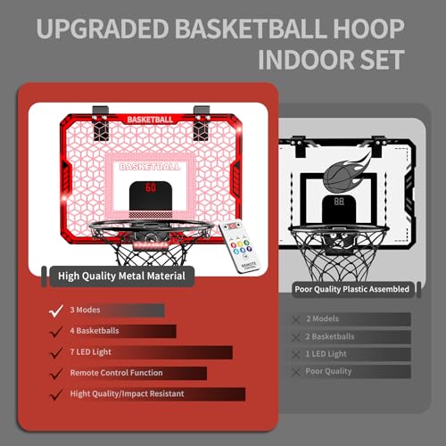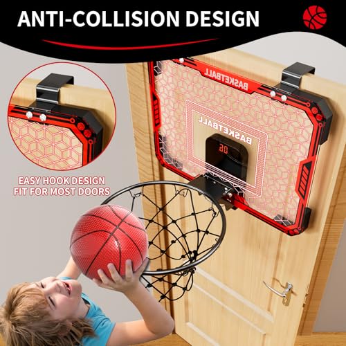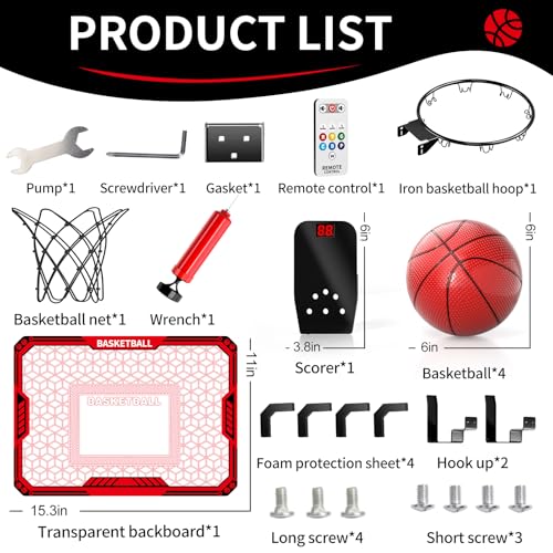Mini Basketball Hoops: Our mini basketball hoop for door includes electronic scoreboard, 4 mini basketballs and a pump so that you can inflate and use right away. Comes with a clear manuals and all tools necessary, it has everything you need to play a game of indoor basketball.