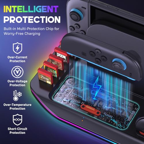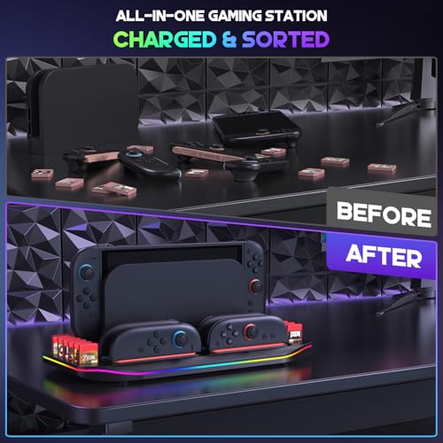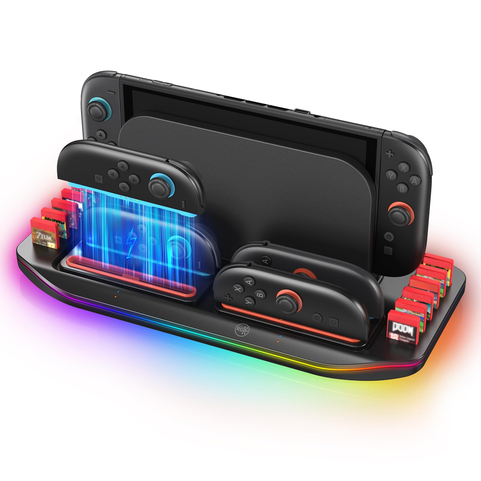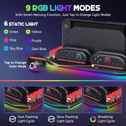 - 9 RGB Lighting Modes Switch 2 Charging Station: Personalize your gaming station with vibrant colors. Simply tap to cycle through 6 static colors, 2 flashing effects, and a soothing breathing mode. The smart memory function automatically restores your RGB lighting mode from the last session upon turning it on