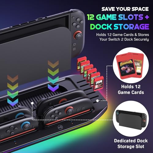 - All-in-One Storage for Games & Dock: Transform this Switch 2 charger into your complete gaming organization station. It securely organizes 12 game cards and provides a dedicated space for your original dock station, all while saving space and keeping your setup tidy