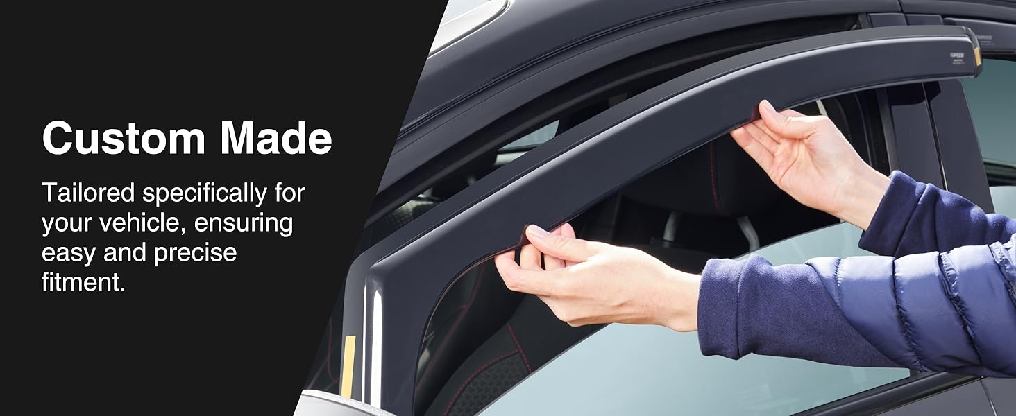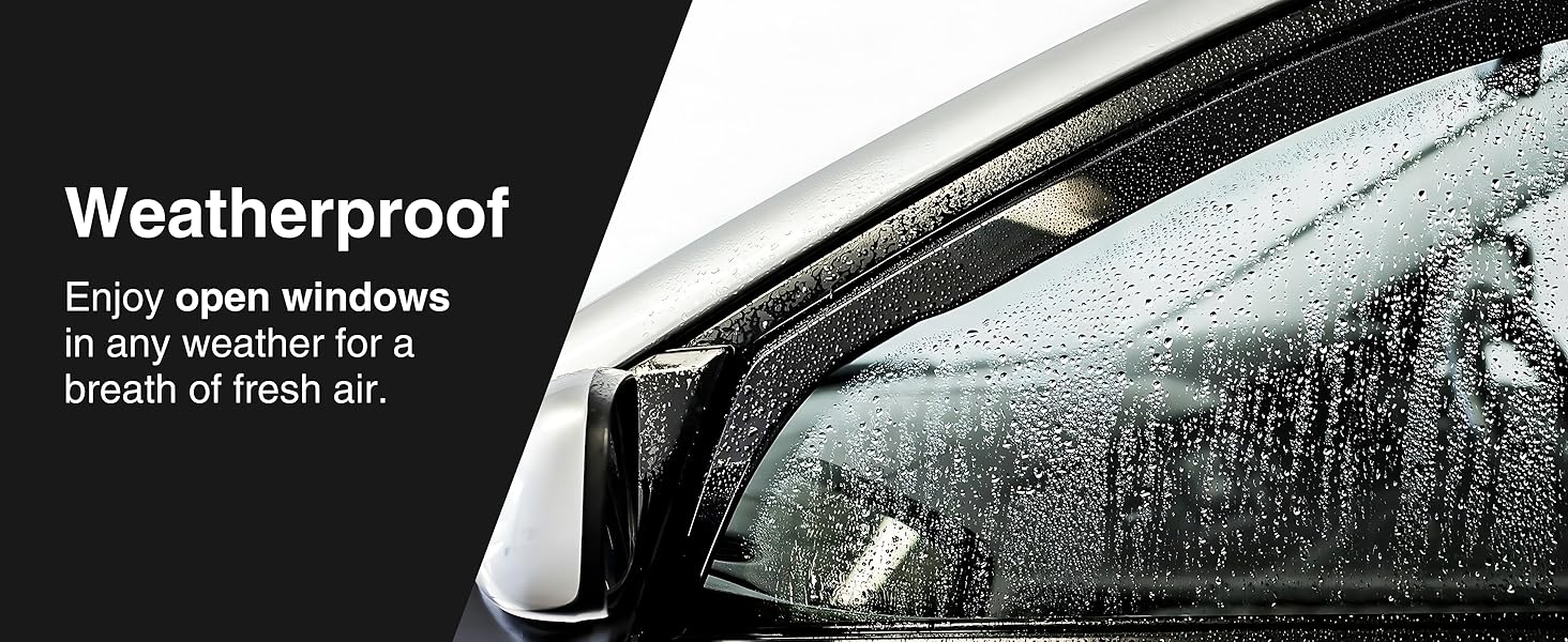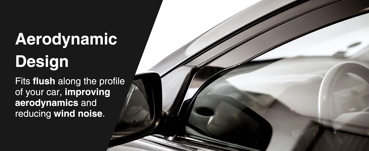 - Optimal Airflow & Cool Interior: Park your car with confidence, knowing you can leave your windows slightly open without worrying about excessive heat build-up. Our Wind Deflectors promote optimal airflow, keeping your car's interior cool and pleasant, even on scorching summer days. Say goodbye to the stuffy, sweltering atmosphere and welcome a refreshing breeze every time you return to your vehicle.