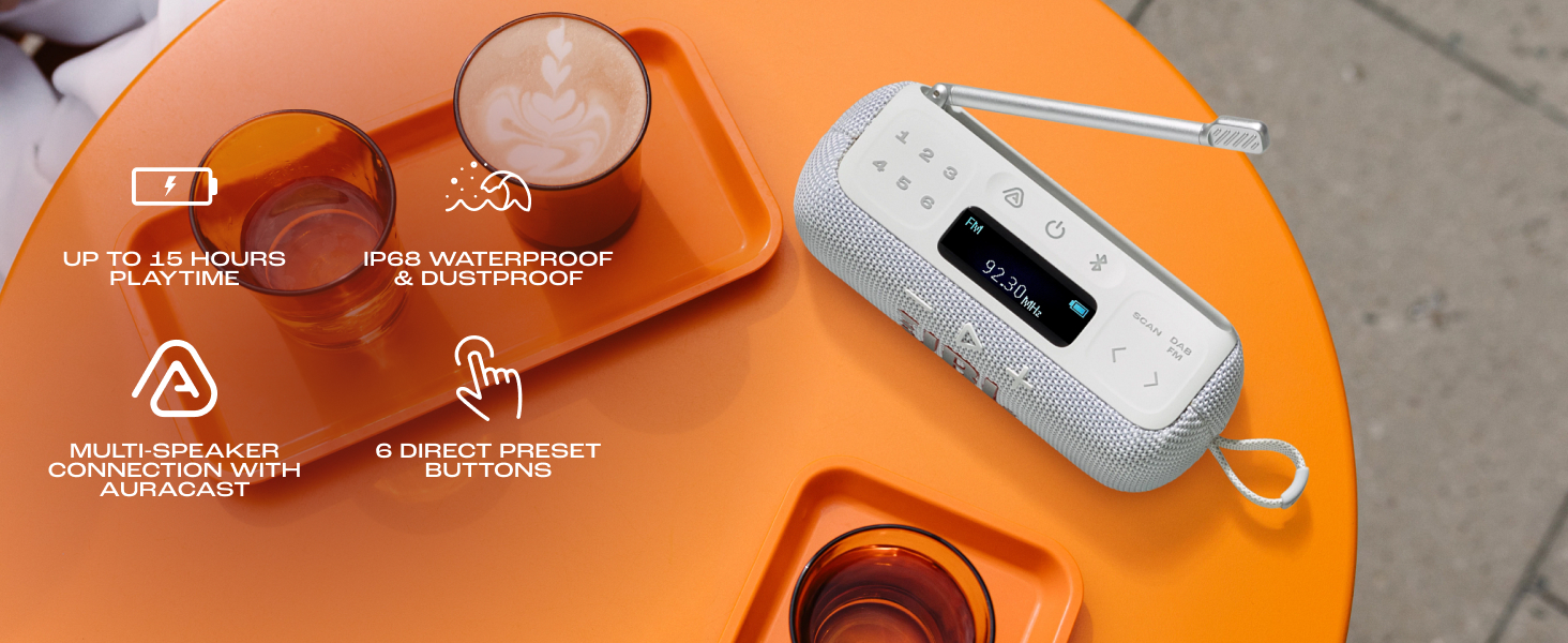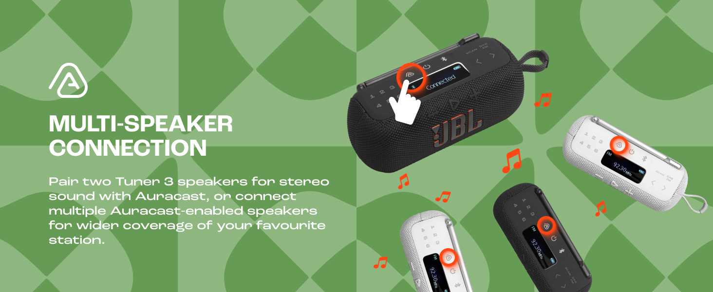 Preset Controls & Auracast: Easily access your favourite radio stations with 6 preset buttons or enjoy stereo sound by pairing two speakers or connecting multiple Auracast-enabled JBL speakers for wider coverage